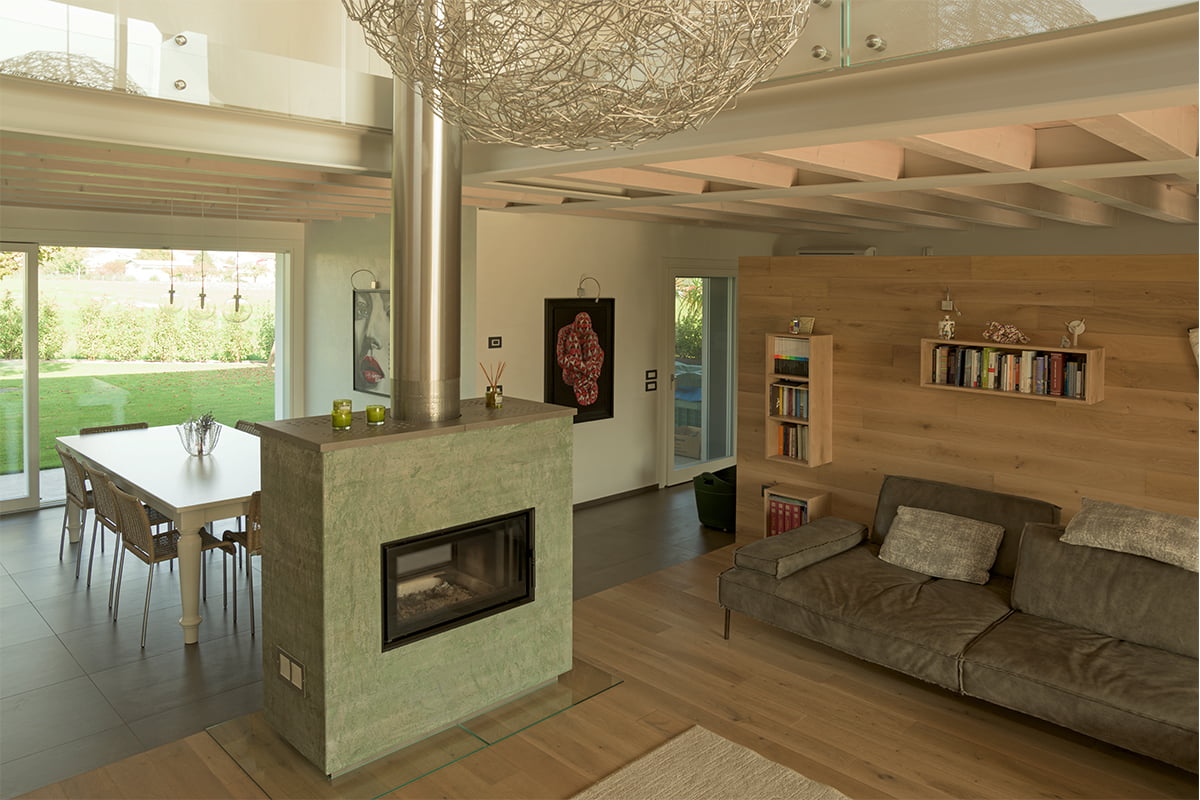 Il progetto propone, in chiave moderna, alcuni schemi compositivi riconducibili al modo di costruire tipico delle nostre campagne e se vogliamo anche delle ville venete; pianta rettangolare tripartita con la copertura a due falde inclinate. Ben visibile all'esterno sono le tre zone più importanti della casa: a servizi, giorno e pranzo. Alla semplicità della pianta si contrappone uno studio molto preciso sull’aspetto della sostenibilità energetica e sul confort abitativo. L’orientamento del lotto di progetto dell’edificio ci aiuta, in questo caso, nel progettare seguendo il corretto irraggiamento dei locali interni. Questo aspetto si traduce in ampie vetrate a sud che permettono, nei mesi invernali, di sfruttare le potenzialità termiche del sole. Nei mesi estivi il problema opposto, ossia impedire al sole di entrare e riscaldare i locali interni. Per ovviare a questo problema è stato realizzato un ampio serramento, posizionato a filo esterno del portico sud, con funzione di frangisole. Questo portellone con apertura a bilico potrà essere posizionato verticale, quindi coprire interamente le vetrate e schermarle dal sole, oppure tenuto aperto ruotato di 90° con funzione di pompeiana o brise soleil in legno o alluminio.